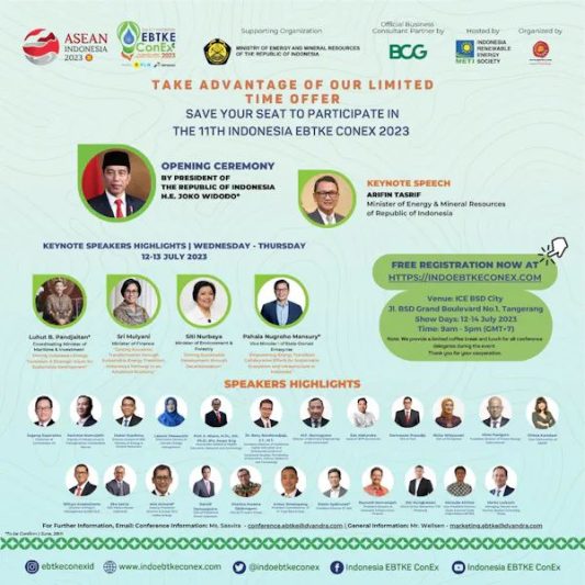 “Sudah banyak komitmen yang dicanangkan pemerintah Indonesia untuk mencapai target tersebut. Oleh sebabnya, penting bagi METI untuk memastikan komitmen tersebut dengan sebuah aksi yang nyata, salah satunya dengan acara ini,” ungkap Ketua Steering Committee Indonesia EBTKE ConEx 2023, Eka Satria, saat konferensi pers di Jakarta pada tanggal 5 Juli 2023.
