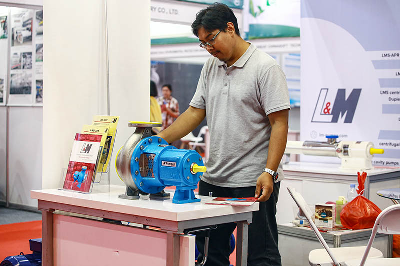 Peserta pameran sedang menjelaskan produk mesin pompa air kepada pengunjung.