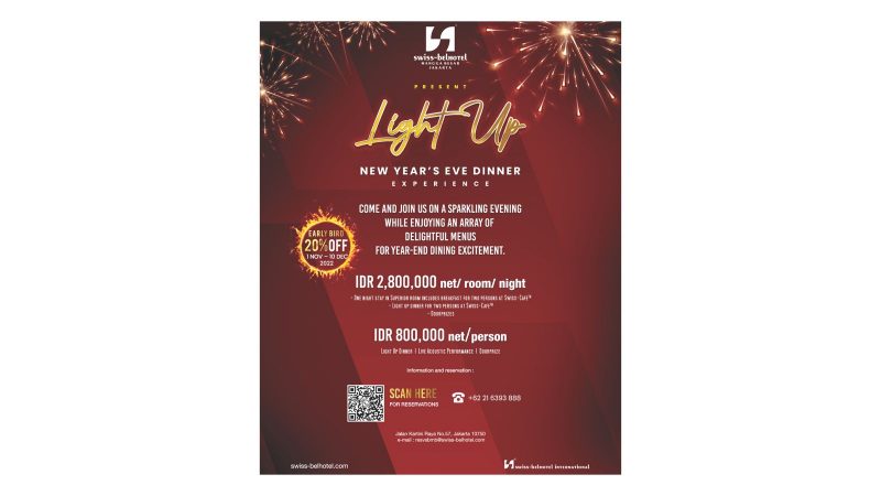 Sementara itu, malam tahun baru dapat dirayakan di Swiss-Belhotel Mangga Besar dengan harga mulai dari Rp2.800.000 net/kamar/malam. Mengambil tema “Light Up New Year’s Eve”, para tamu dapat menginap di kamar Superior, mendapatkan makan pagi, hingga makan malam tahun baru untuk dua orang di Restoran Swiss-Café™. Penawaran ini berlaku khusus tamu yang menginap tanggal 31 Desember 2022.