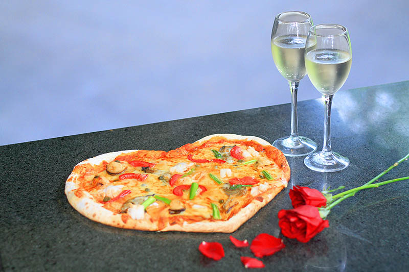 Untuk menambah romansa setiap pasangan, hidangan akan disantap dengan latar taman yang indah dengan pemandangan air mancur di dalamnya. Hanya dengan Rp400.000 net per pasangan, pizza ini dapat dinikmati dengan dua gelas non-alcoholic wine. Tersedia juga sparkling champagne dan pilihan wine lainnya dengan harga yang berbeda.