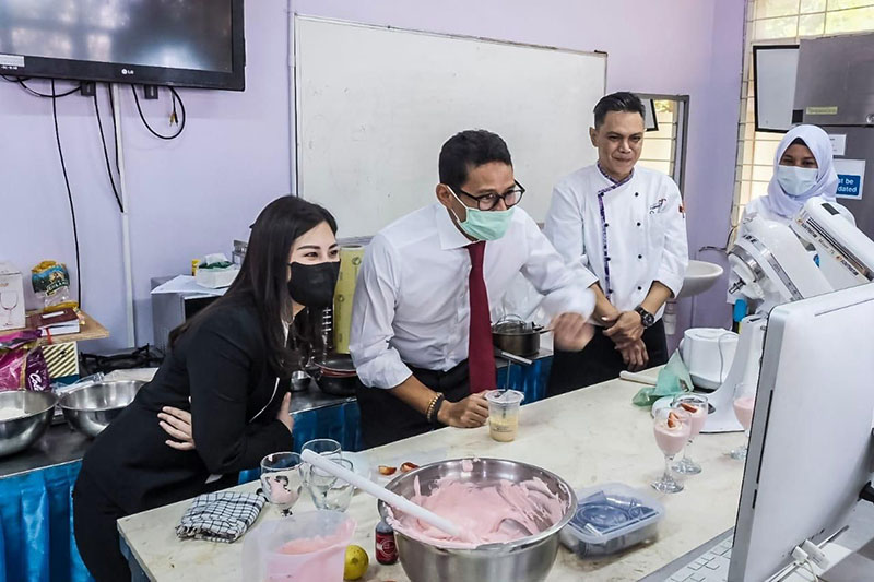 Saat di sana, Menparekraf dan Wamenparekraf meninjau beberapa fasilitas kampus yang dulu dikenal sebagai NHI (National Hotel Institute). Fasilitas yang dikunjungi mulai dari ruang perkuliahan, dapur tempat praktik mahasiswa belajar, laboratorium, hingga berkunjung ke Enhaii Corner 186.
