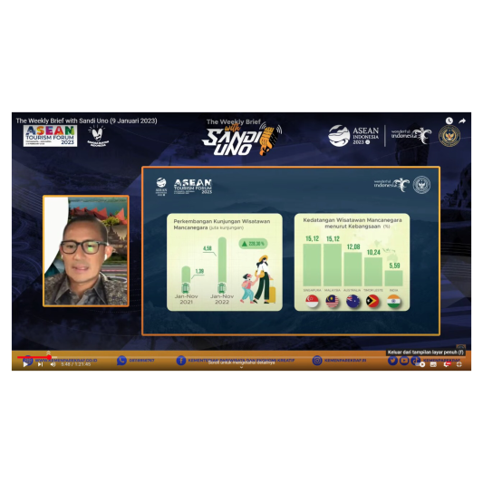 Menteri Pariwisata dan Ekonomi Kreatif, Sandiaga Salahuddin Uno, mengumumkan jumlah kunjungan wisatawan mancanegara ke Indonesia periode Januari hingga November 2022. Berdasarkan data yang terkumpul, jumlah kunjungan wisman ke Indonesia periode Januari hingga November 2022 mencapai 4,58 juta kunjungan, naik 228,30 persen dibandingkan dengan periode yang sama tahun 2021.