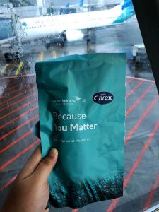 Tidak hanya di dalam bandara, protokol kesehatan juga dijalankan dengan baik saat melakukan perjalanan udara bersama Garuda Indonesia. Sebelum memasuki pesawat, penumpang wajib melakukan jaga jarak saat berada di antrean masuk boarding gate. Setelahnya, penumpang akan diberikan personal health kit yang berisikan perlengkapan kesehatan seperti masker dan hand sanitizer.